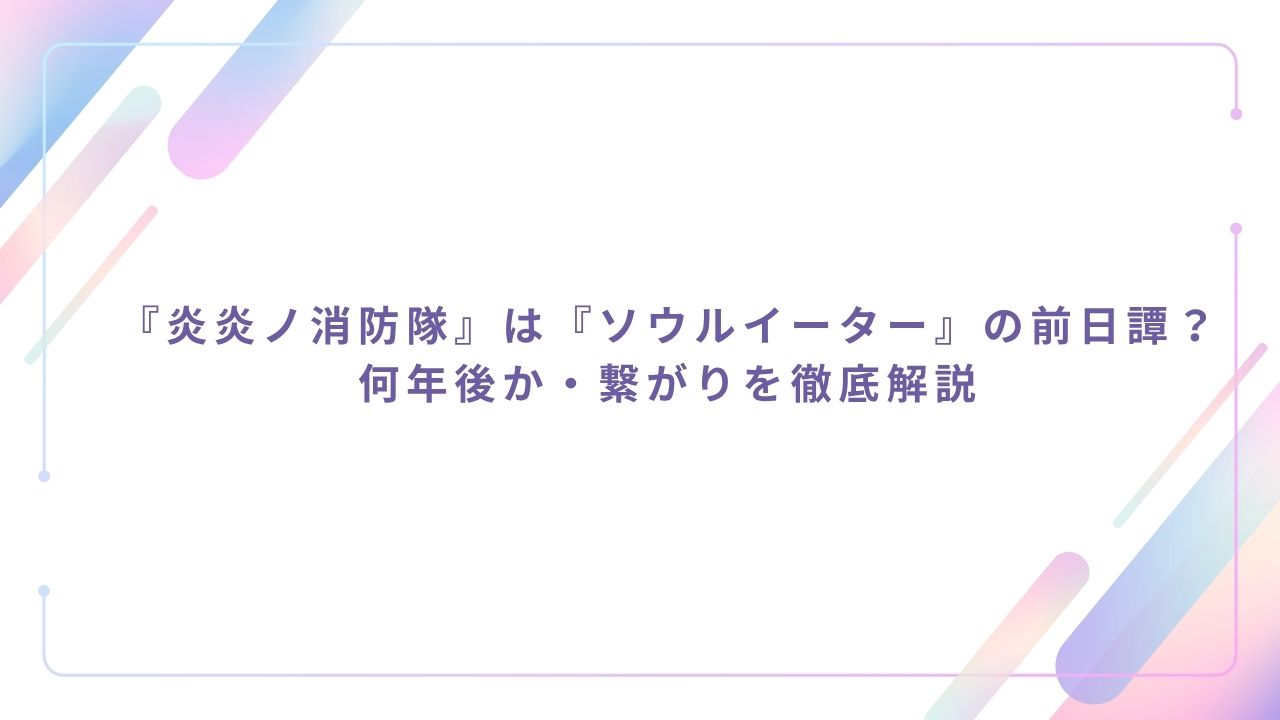 今回は、『炎炎ノ消防隊』と『ソウルイーター』の繋がりについて、時間軸やキャラクターの相関図を交えて徹底解説しました。